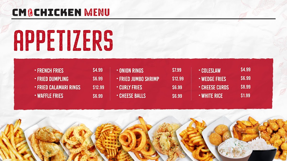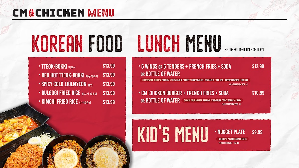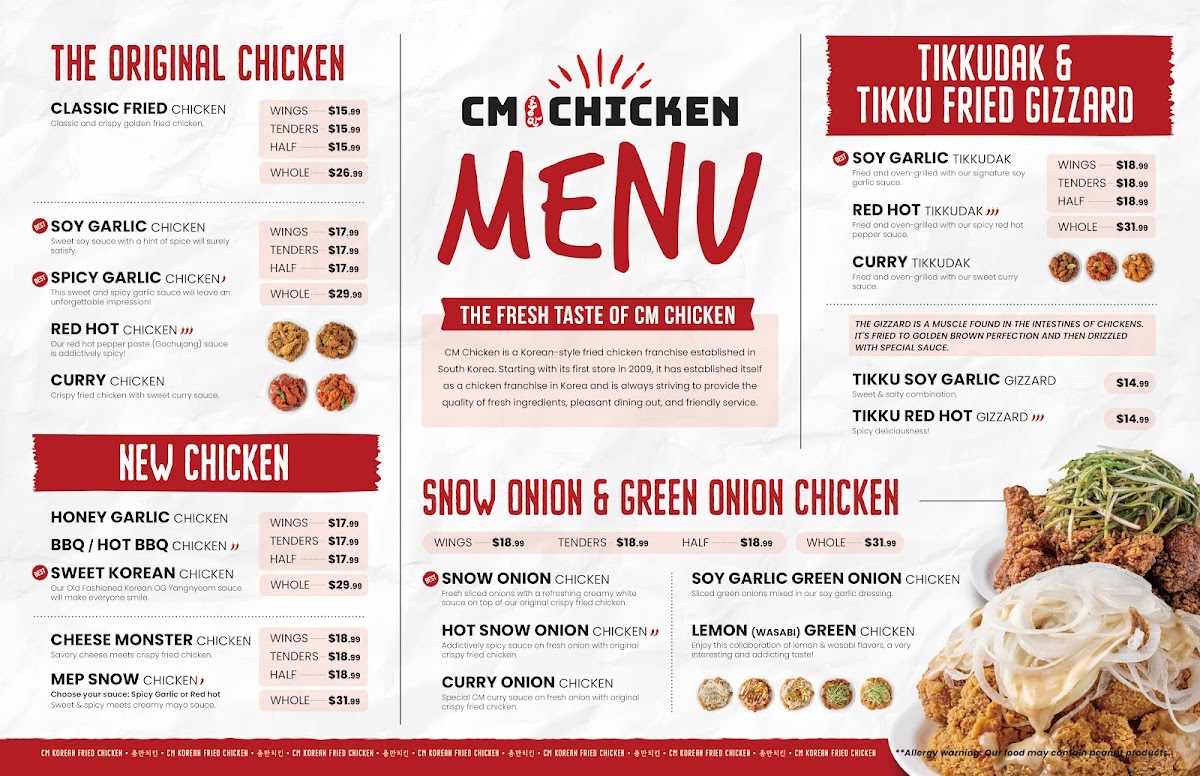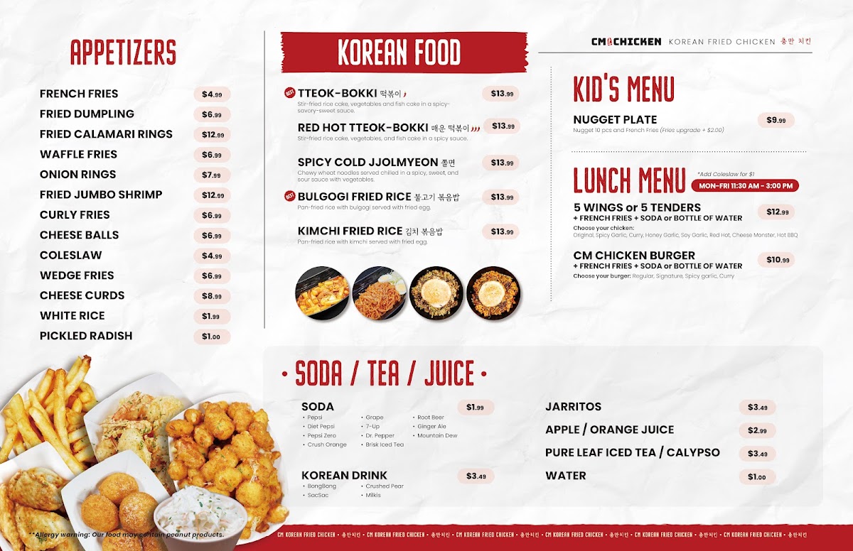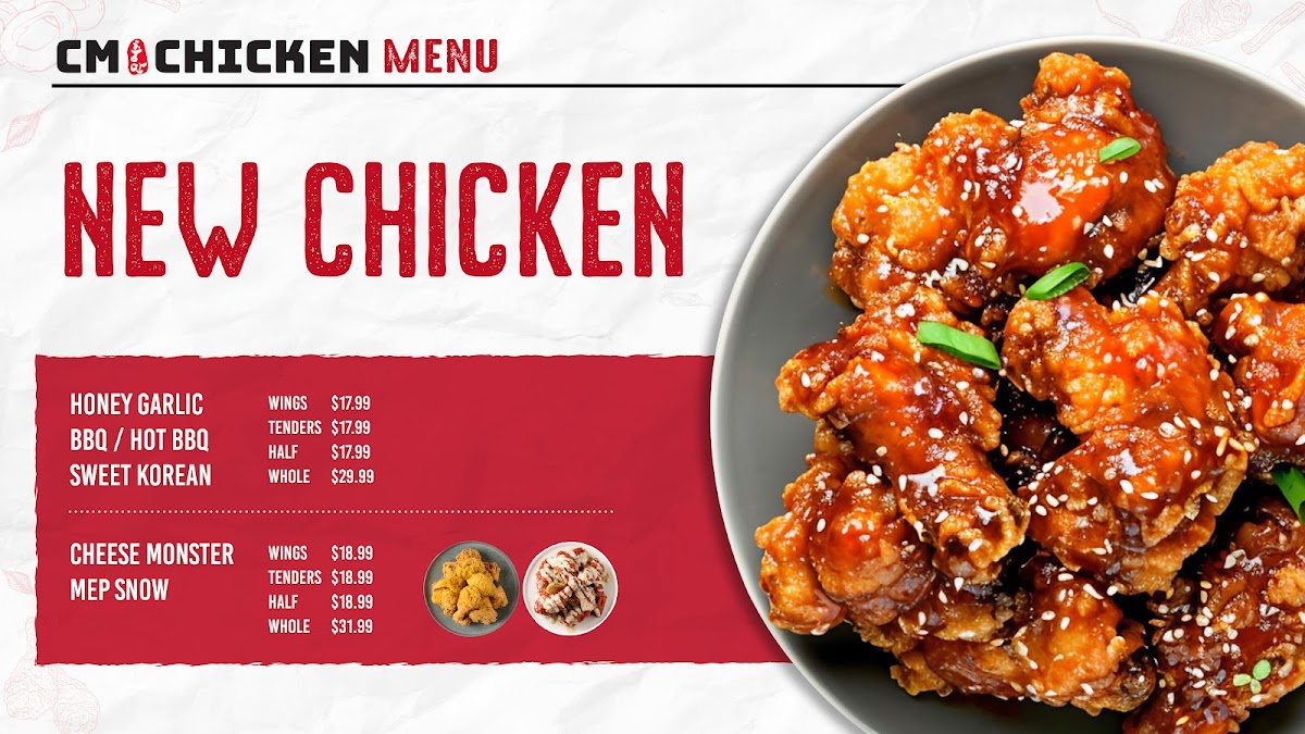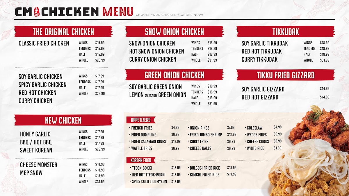 Welcome to CM Korean Fried Chicken 충ᄡᅡᆫ 치킨, located in the heart of Chicago! This cozy eatery specializes in mouthwatering Korean fried chicken, renowned for its crispy texture and rich flavors. Customers rave about the garlic spicy chicken tenders, which strike the perfect balance between heat and taste, making them a must-try. The snow chicken, topped with a creamy onion sauce, adds a delightful twist that keeps everyone coming back for more.